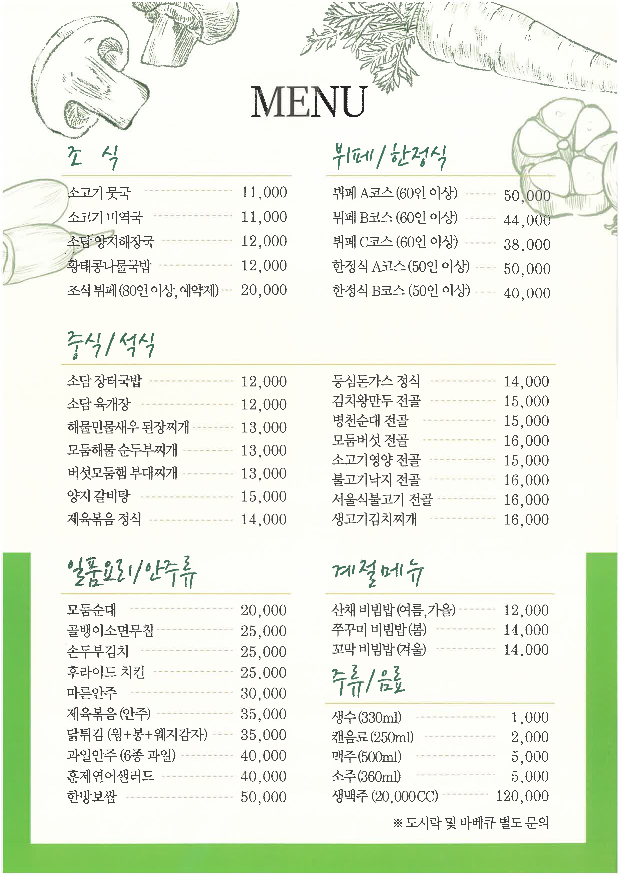 - 연회 및 각종세미나 등 규모와 성격에 따라 계절에 맞는 실속형. 다양한 메뉴들로 고객님들의 뜻깊은 행사진행을 위해 언제나 최선을 다하고 있습니다.